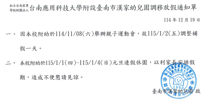 漢家幼兒園調移放假通知